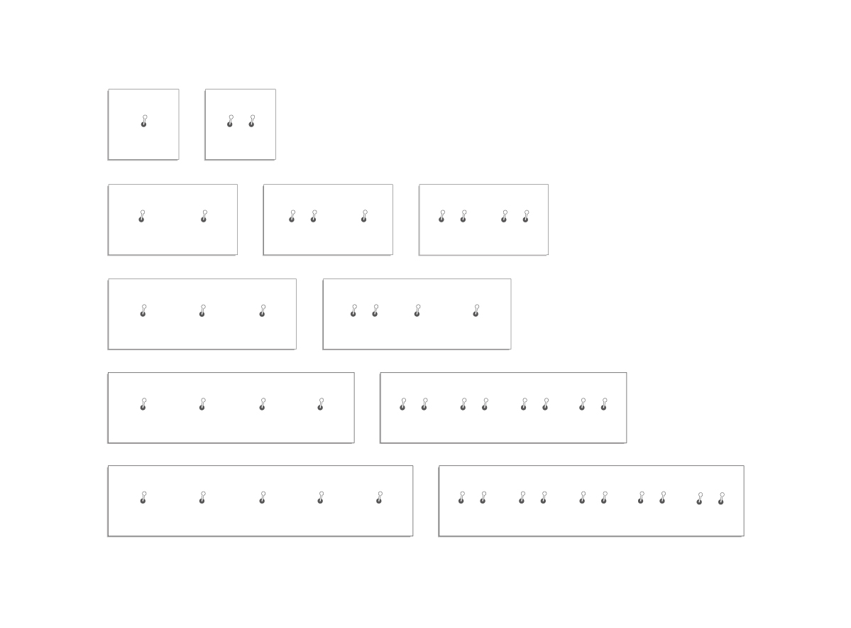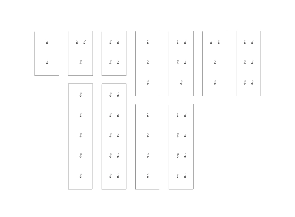 5 sizes of panel: simple 85 x 85 mm, double 85 x 156 mm, triple 85 x 227 mm, quad 85 x 298 mm, quintuple 85 x 369 mm. For vertical or horizontal use.